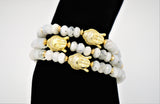 This bracelet features a center Buddha head with rainbow moonstone beads and gold accents.