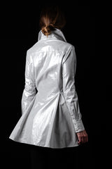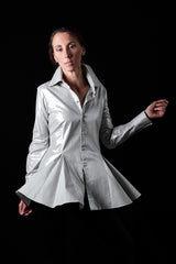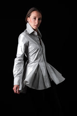The Maggie Blouse is hard to resist. This glamourous fabric with reversed cuffs and pleats are dramatic. It's savvy and edgy while sustaining the collection's classic and chic look.